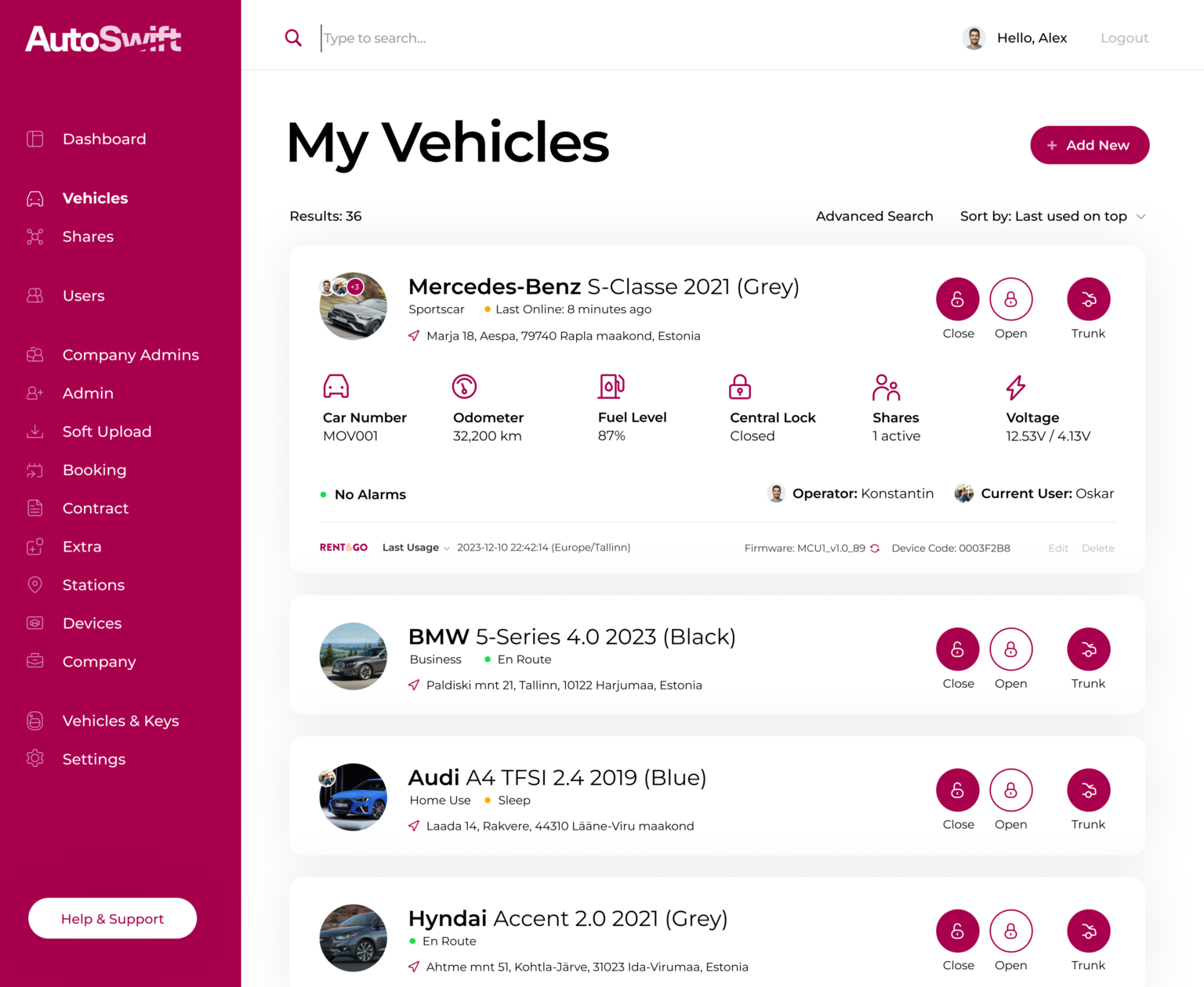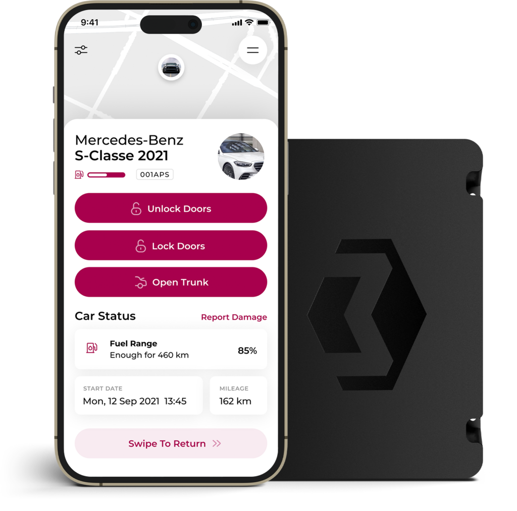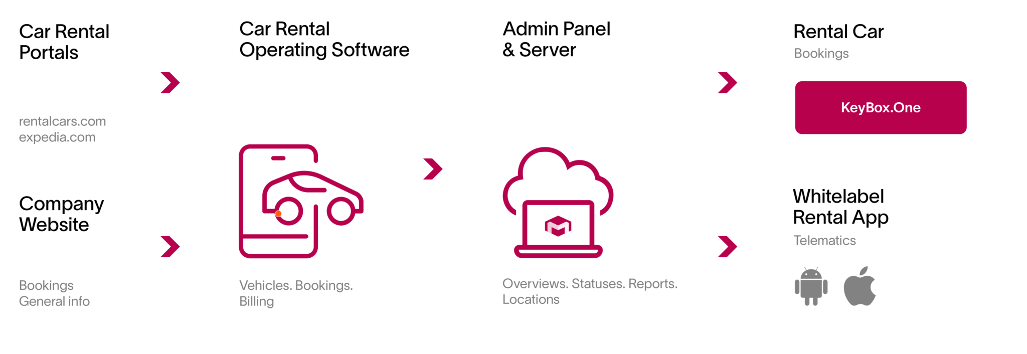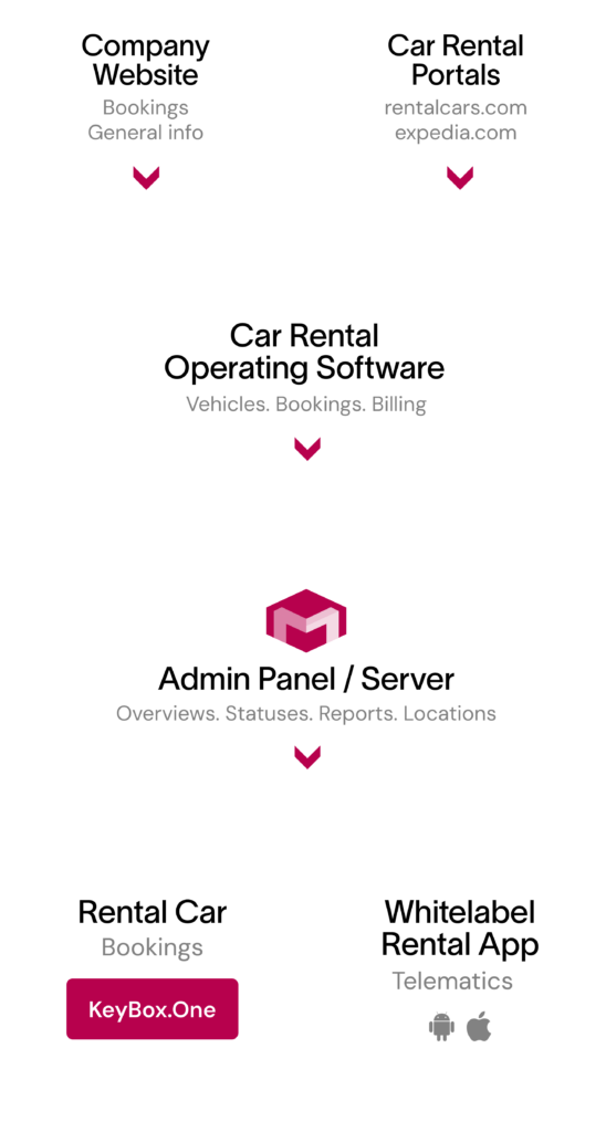 Car rental software forwards information to Movitronic regarding dedicated vehicle access and booking details. This enables Movitronic to assign access credentials to specific vehicles and users through the API, easily integrable with any car rental software, including Wheelsys, Thermeon, myrent, Carhire Manager Web, etc.